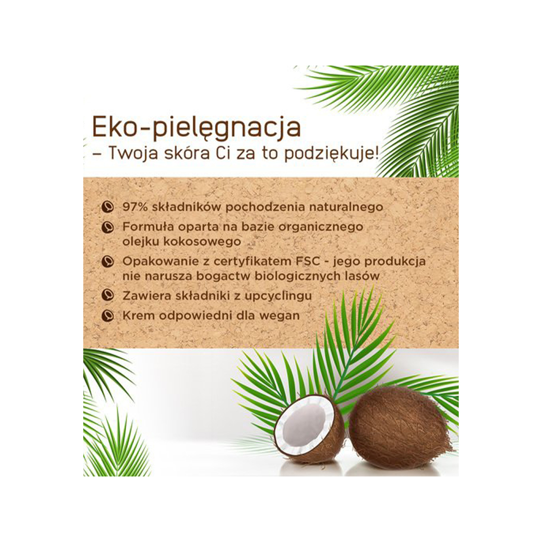 - Organiczny olejek kokosowy – zapewnia intensywne nawilżenie, głęboko odżywia i rewitalizuje skórę, przywracając jej naturalną miękkość i sprężystość.