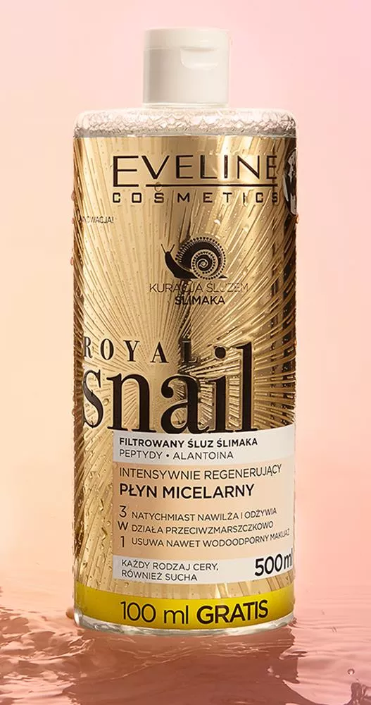 Eveline Royal Snail to intensywnie regenerujący płyn micelarny 3w1 o pojemności 500ml, który skutecznie usuwa makijaż oczu, twarzy i ust oraz dokładnie oczyszcza skórę. Bogata formuła dodatkowo łagodzi, nawilża i wspomaga regenerację naskórka, zapewniając idealnie czystą, odświeżoną i zregenerowaną cerę.