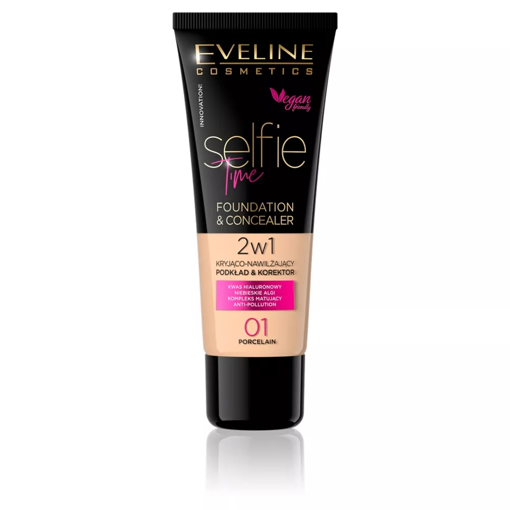 Eveline Selfie Time to nowoczesny podkład i korektor 2 w 1, który doskonale łączy właściwości kryjące z nawilżającymi. Dzięki możliwości stopniowania krycia, idealnie maskuje cienie, przebarwienia i zaczerwienienia, nie tworząc efektu maski. Jego lekka konsystencja idealnie dopasowuje się do skóry, zapewniając długotrwały efekt i naturalny wygląd. Formuła wzbogacona kwasem hialuronowym, składnikami nawilżającymi oraz witaminą E doskonale nawilża cerę i dodaje jej blasku.