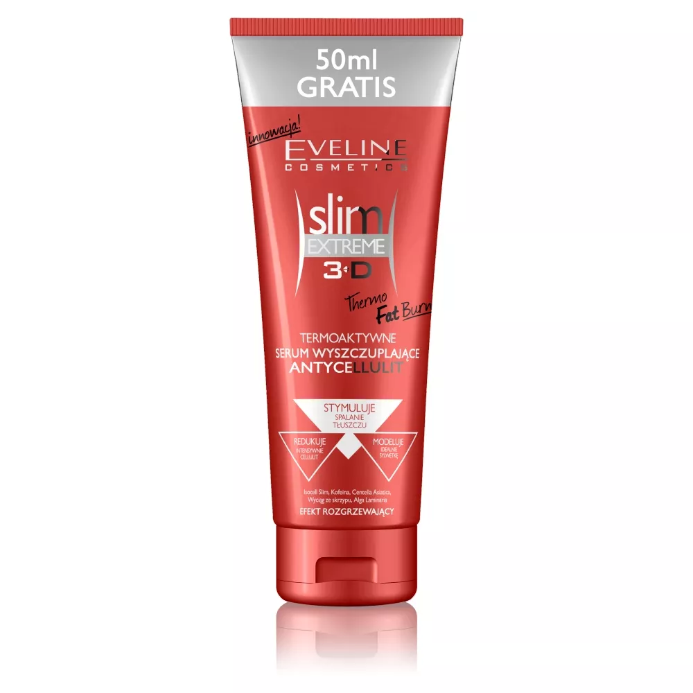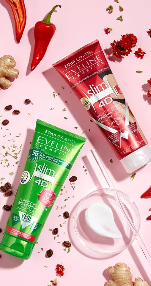 Innowacyjna formuła Eveline Slim Extreme 4D koncentruje się na walce z uporczywym cellulitem i nagromadzonym tłuszczem, pomagając udoskonalić kształt kobiecego ciała. Technologicznie zaawansowany booster Thermo Fat Burner™ delikatnie rozgrzewa, umożliwiając redukcję komórek tłuszczowych, dzięki czemu skóra staje się bardziej jędrna, a sylwetka nabiera idealnych kształtów.