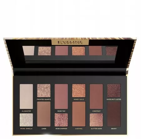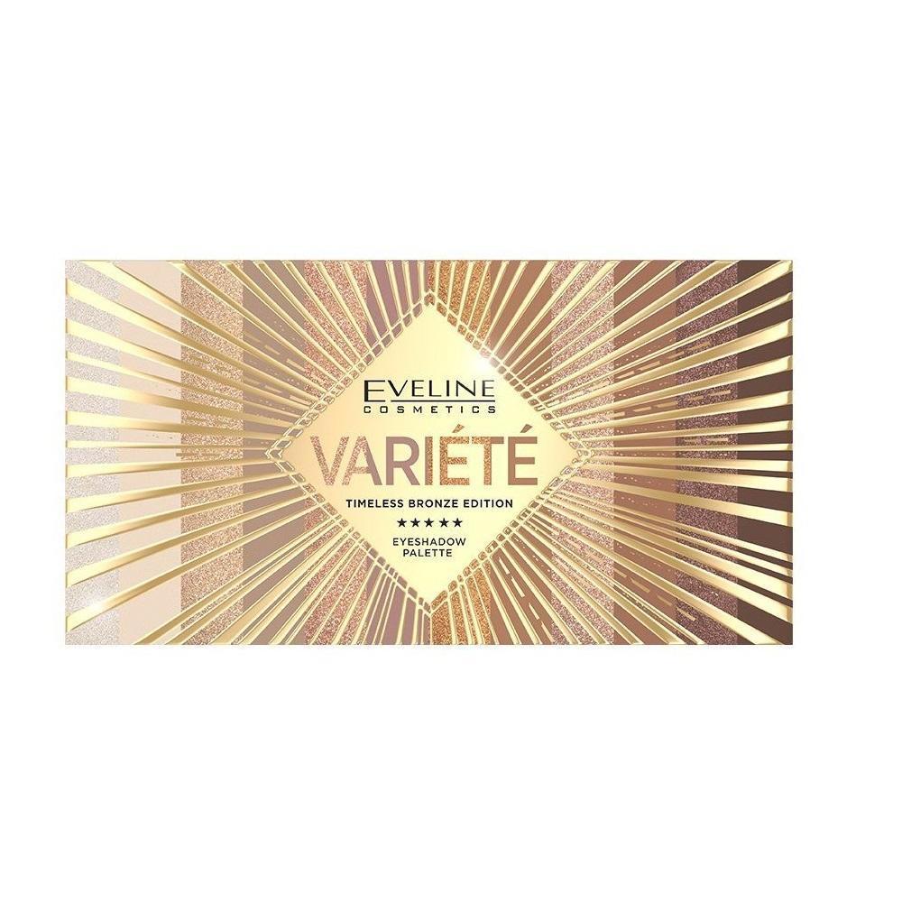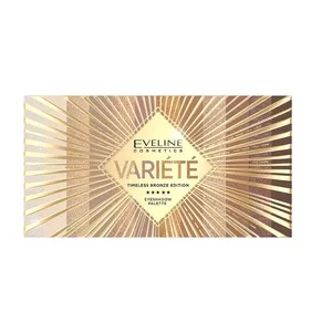 Paleta 12 klasycznych barw Eveline Variété Timeless Bronze Edition to ponadczasowa propozycja, która łączy beżowe odcienie z delikatnym różem. Dzięki tej kombinacji stworzysz wyjątkowe makijaże - zarówno na eleganckie wieczorne wyjście, jak i na poranne spotkanie z przyjaciółmi. Barwy te doskonale pasują do każdej karnacji, od ciemniejszej po jaśniejszą. Wysoka trwałość produktu oraz doskonała pigmentacja pozwolą Ci cieszyć się stylizacją przez cały dzień i noc. Matowe i połyskujące cienie łatwo się blendują, a ich miękka formuła ułatwia aplikację na powieki. Opakowanie zawiera wygodne, duże lusterko, co czyni je idealnym do użytku w podróży.