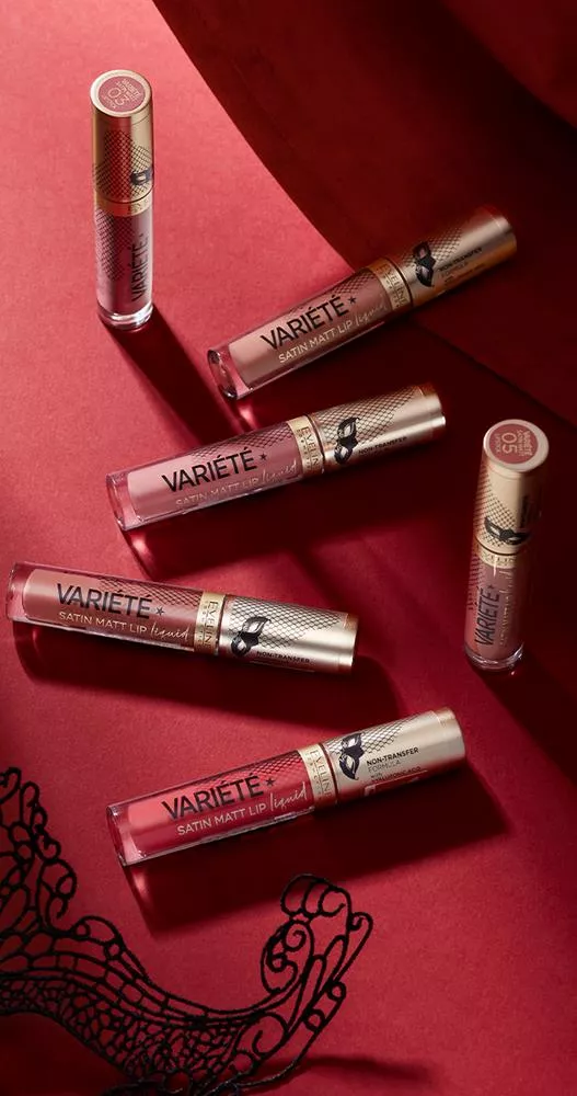 Innowacyjna, niezwykle lekka i jednocześnie trwała pomadka w płynie Eveline Variété zapewnia matowy, nasycony kolor makijażu ust. Łatwo rozprowadza się na ustach, a mimo swojej lekkości, gwarantuje pełne krycie już przy pierwszej warstwie. Po wyschnięciu pozostaje na ustach, nie przenosząc się na maseczkę. Formuła z unikalnym kompleksem nawilżającym, zawierającym kwas hialuronowy i witaminę E, pielęgnuje delikatny naskórek, zapobiegając wysuszeniu ust i zapewniając matowy efekt makijażu. Uzależniający, czekoladowy zapach sprawia, że aplikacja staje się wyjątkową przyjemnością. Pomadka dostępna jest w 6 uniwersalnych kolorach.
