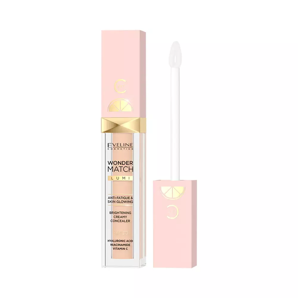 Korektor rozświetlający Eveline Wonder Match Lumi to kolejna odsłona popularnej serii Wonder Match, która łączy pielęgnację z udanym makijażem. Jego lekka formuła troszczy się o optymalne nawilżenie skóry, zmniejszając widoczność przebarwień oraz zaczerwienień. Cienie pod oczami staną się niewidoczne! Kremowa konsystencja wzbogacona kwasem hialuronowym, niacynamidem i witaminą C odżywia i wzmacnia strukturę cery. Dodatkowo zawiera SPF 20, jest odporna na pot i charakteryzuje się dużą trwałością, dzięki czemu korektor sprawdzi się w każdych warunkach. Skóra stanie się przyjemnie rozświetlona i doskonale wypielęgnowana!