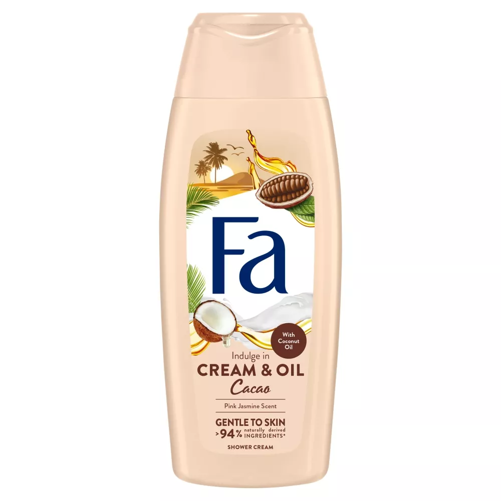 Odkryj nowe Fa i zanurz się w fascynującej świeżości dzięki Fa Cream & Oil Cacao kremowemu żelowi pod prysznic. Ta wyjątkowa formuła wzbogacona o olejek kokosowy, z odświeżającym i relaksującym zapachem masła kakaowego, przeniesie Cię w tropikalną podróż podczas każdej kąpieli. Odśwież swoje ciało i umysł, pozwalając swoim zmysłom odkrywać nowe, odległe zakątki świata.