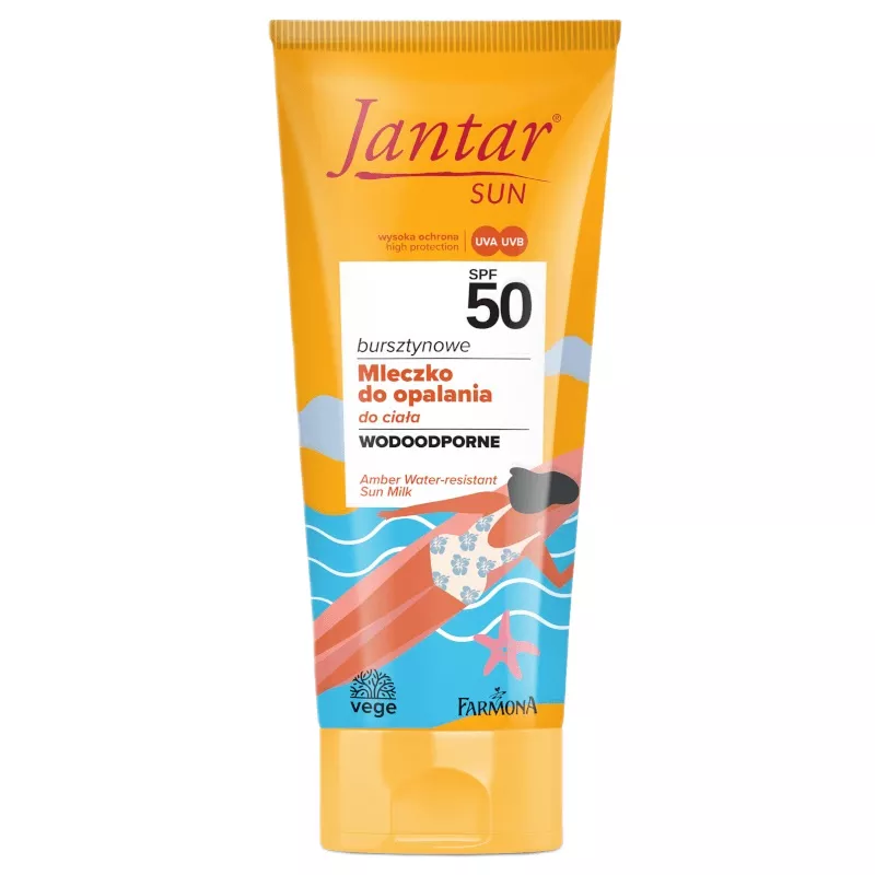 Farmona Jantar Sun bursztynowe wodoodporne mleczko do opalania SPF50 to innowacyjny, w 100% wegański kosmetyk zapewniający bardzo wysoką ochronę przeciwsłoneczną oraz intensywną pielęgnację skóry podczas ekspozycji na słońce. Formuła została wzbogacona o cenne składniki aktywne, takie jak esencja bursztynowa, ekstrakt z kurkumy, masło shea, witamina E i olej kokosowy, które nie tylko skutecznie chronią, ale także nawilżają i odżywiają skórę. Dzięki zastosowaniu nowoczesnych systemów ochrony, mleczko zabezpiecza skórę przed szkodliwym działaniem promieniowania UVA, UVB, podczerwonego (IR), niebieskiego (VL) oraz widzialnego (HEV). Produkt jest piaskoodporny i wodoodporny, co gwarantuje komfort podczas aktywności na plaży i kąpieli.
