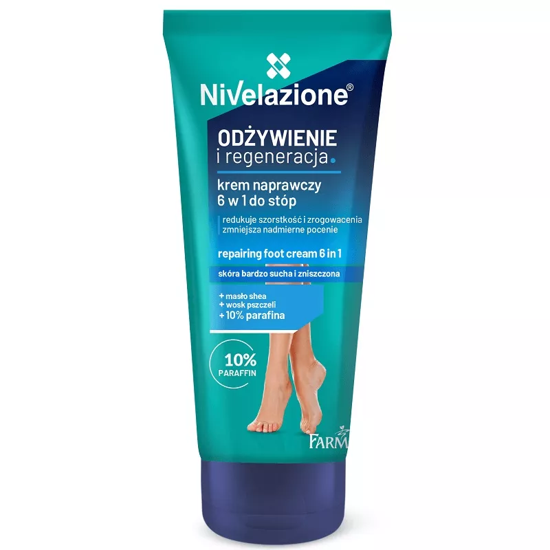 Farmona Nivelazione Krem Naprawczy 6w1 do Stóp to doskonałe rozwiązanie dla osób borykających się z problemem bardzo suchej i zniszczonej skóry stóp. Dzięki unikalnej formule zawierającej 10% parafiny, masło Shea oraz wosk pszczeli, zapewnia intensywne odżywienie i regenerację, jednocześnie chroniąc przed poceniem i nieprzyjemnym zapachem.