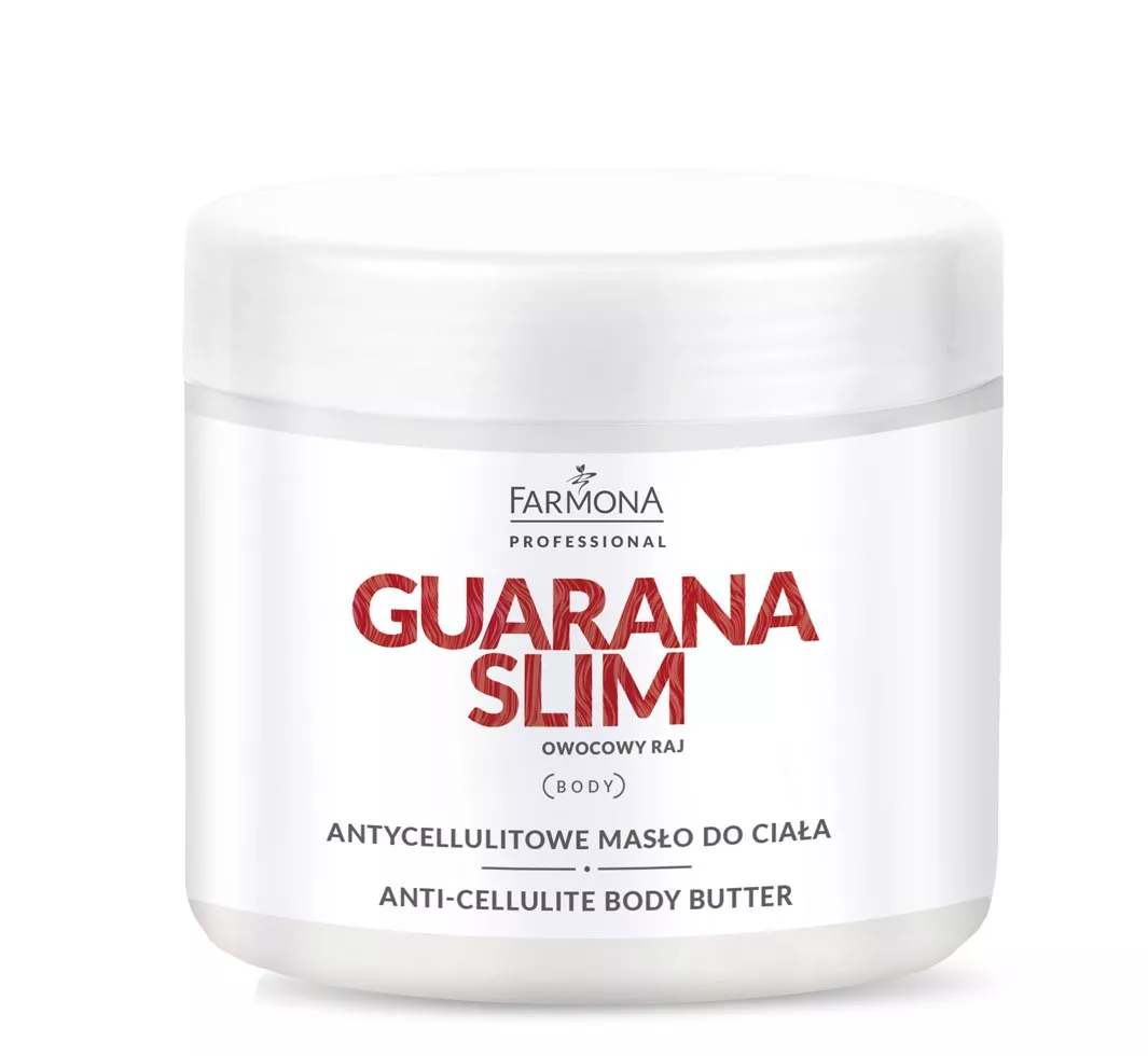 Farmona Professional Guarana Slim to antycellulitowe masło do ciała o pojemności 500 ml, stworzone z myślą o pielęgnacji skóry z widocznym cellulitem wodnym lub tłuszczowym, nadmiarem tkanki tłuszczowej oraz wymagającej detoksykacji. Innowacyjna formuła oparta na aktywnych składnikach, takich jak L-karnityna, ekstrakt z guarany oraz imbir, skutecznie wspiera walkę z niedoskonałościami skóry, poprawiając jej jędrność, elastyczność i ogólną kondycję.