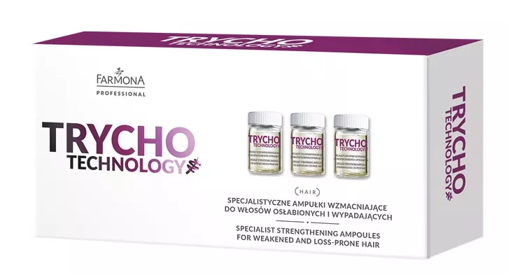 Farmona Professional Trycho Technology to specjalistyczne ampułki wzmacniające przeznaczone do każdego rodzaju skóry głowy i włosów. Produkt został opracowany szczególnie z myślą o osobach borykających się z problemem włosów osłabionych, rzadkich, cienkich, wolno rosnących oraz z tendencją do wypadania. Zaawansowana formuła oparta na kompleksie aktywnych składników, takich jak trichogen, witamina B3 oraz biolin, zapewnia intensywne wsparcie i regenerację dla wymagających włosów.