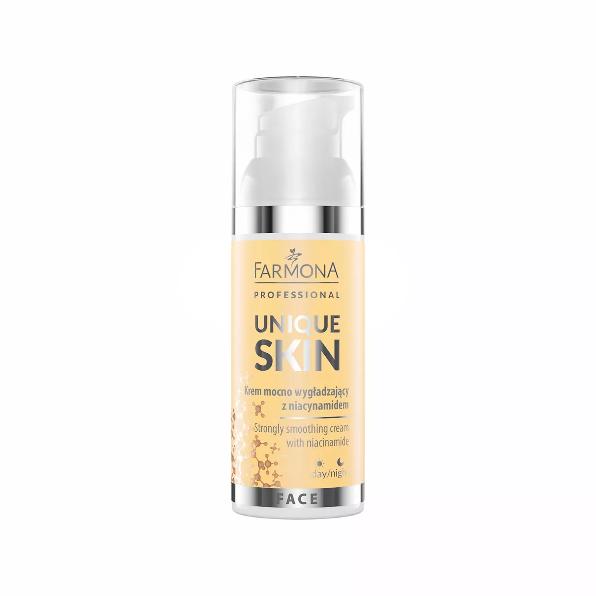 Farmona Professional Unique Skin to intensywnie wygładzający krem do twarzy z niacynamidem, stworzony z myślą o każdym rodzaju skóry, w szczególności wiotkiej, mało elastycznej, szarej i zmęczonej. Zaawansowana formuła skutecznie regeneruje, ujędrnia i uelastycznia skórę, a także poprawia jej koloryt i zapewnia głębokie nawilżenie. Krem wykorzystuje moc niacynamidu oraz kompleks składników aktywnych, które przywracają skórze młodzieńczy wygląd i zdrowy blask.