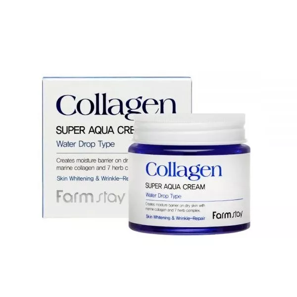 FarmStay Collagen Super Aqua Cream to kolagenowy krem intensywnie nawadniający, który dzięki unikalnej formule water drop z łatwością wchłania się w skórę. Po aplikacji rozpada się na drobne kropelki, tworząc skuteczną barierę ochronną przed utratą wilgotności. Dzięki temu Twoja skóra zyskuje świeżość, gładkość oraz długotrwałe nawilżenie.