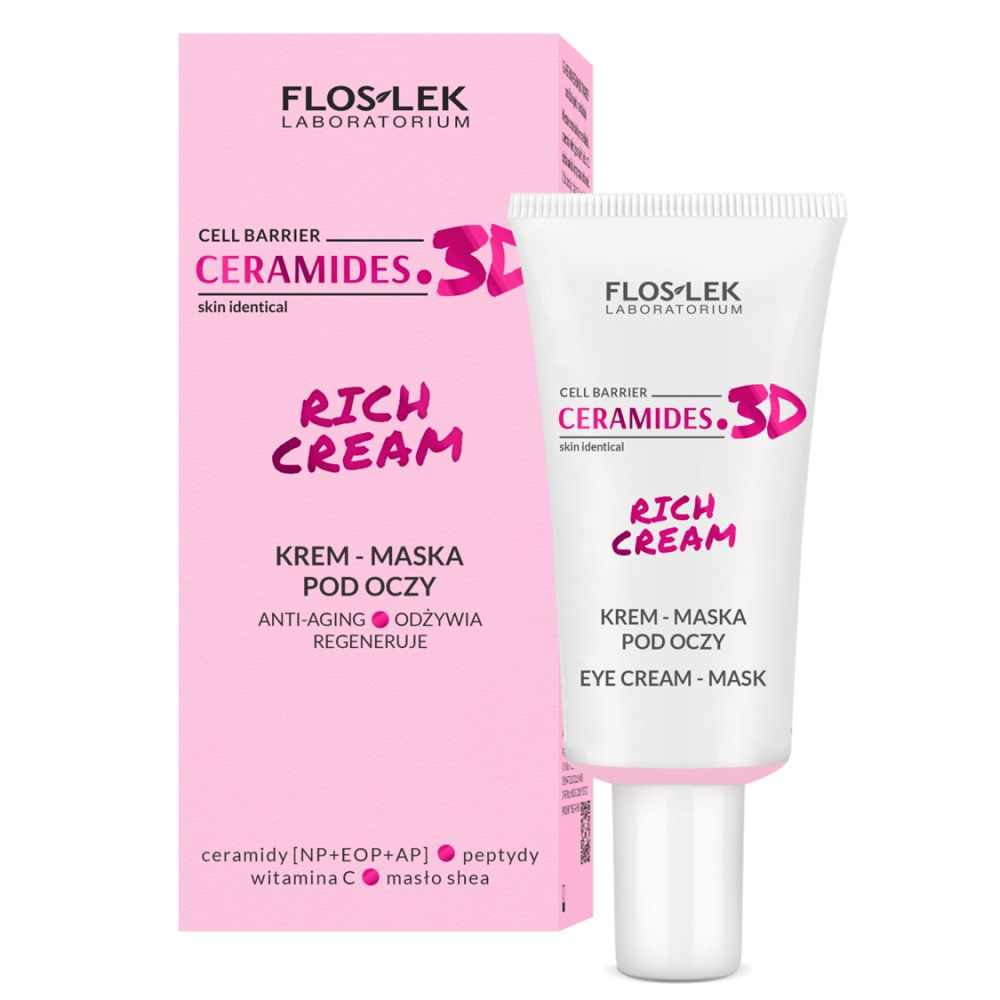 Floslek Ceramides.3D Rich Cream to lekki krem-maska pod oczy stworzony z myślą o dzienno-nocnej pielęgnacji delikatnej skóry wokół oczu. Dzięki zawartości ceramidów, regularne stosowanie tego kremu redukuje zmarszczki w trzech wymiarach: objętości, głębokości i powierzchni. Produkt skutecznie łagodzi objawy dyskomfortu, takie jak szorstkość, swędzenie oraz nadmierne łuszczenie spowodowane przesuszeniem skóry. Wyrównuje i rozjaśnia koloryt, niwelując oznaki zmęczenia, dzięki czemu skóra staje się promienna i miękka w dotyku.