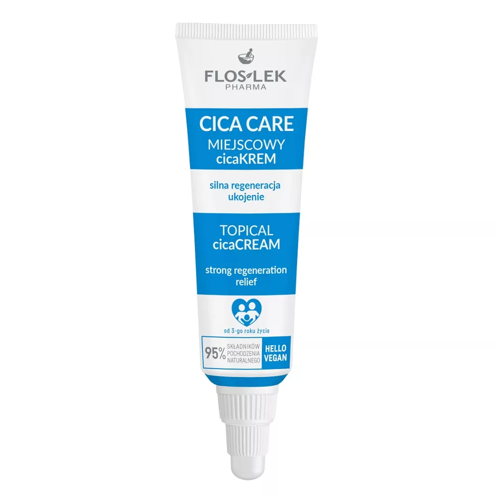 Floslek Cica Care Miejscowy cicaKrem 20ml to specjalistyczny krem SOS stworzony z myślą o intensywnej regeneracji i ukojenia skóry twarzy i ciała. Idealny do stosowania po powierzchownych podrażnieniach, otarciach, goleniu, a także dla skóry suchej, swędzącej, łuszczącej się oraz z atopowym zapaleniem skóry (AZS) i egzemą.