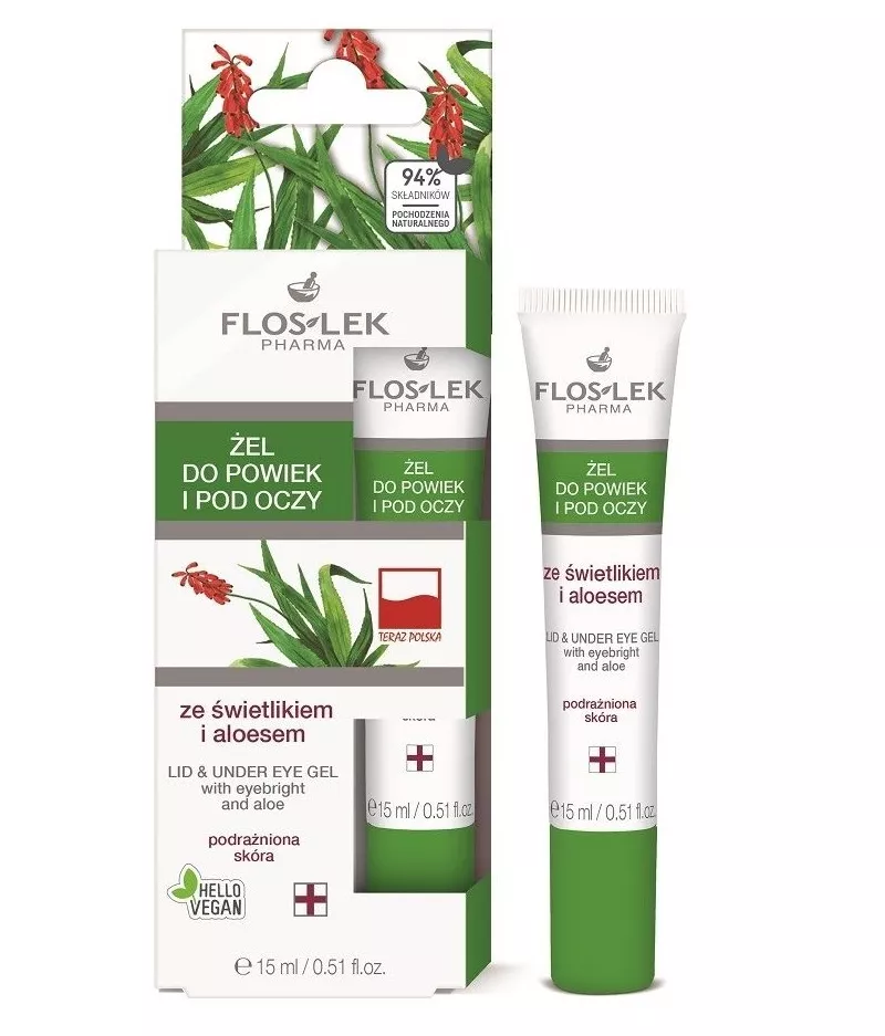 FlosLek Żel do powiek i pod oczy ze świetlikiem i aloesem to bezalkoholowy preparat idealny do pielęgnacji skóry wokół oczu, szczególnie tej skłonnej do podrażnień i zaczerwienień. Doskonały po demakijażu oraz zabiegach kosmetycznych, nawilża i niweluje łuszczenie się naskórka wokół rzęs. Żel skutecznie łagodzi podrażnienia oraz zaczerwienienia, jednocześnie wspierając regenerację skóry. Zawiera aż 94% składników pochodzenia naturalnego, co czyni go bezpiecznym nawet dla najbardziej wrażliwej skóry.