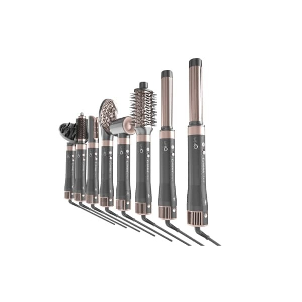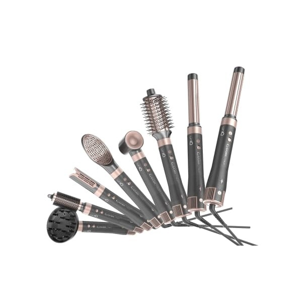 - 8 wymiennych nakładek umożliwia suszenie, prostowanie, kręcenie loków, uniesienie u nasady oraz nadanie objętości.