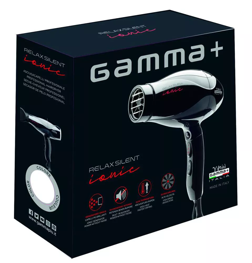 Suszarka Gamma Piu Relax Silent Ionic to wybornej jakości sprzęt wprost idealny do salonów fryzjerskich lub do użytku domowego. Urządzenie wyposażone jest w technologię Relax Silent Technology, która redukuje stres akustyczny oraz minimalizuje hałas. Urządzenie posiada ergonomiczny kształt, dzięki temu nie obciąża stawów oraz nadgarstka. Co więcej, urządzenie redukuje zanieczyszczenia elekromagnetyczne aż o 97%. Grill jest pokryty srebrem 999, dzięki temu emituje cząsteczki Ag+.