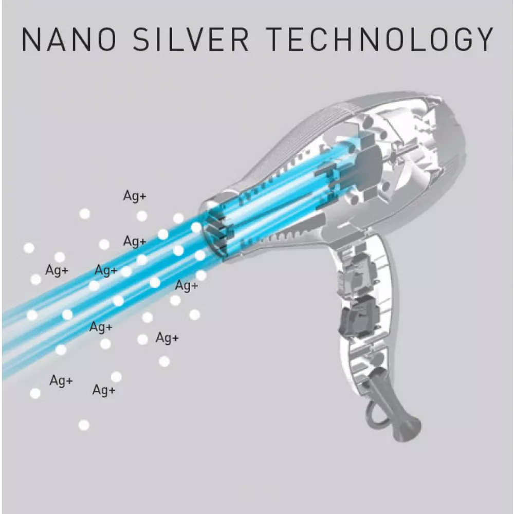 Profesjonalna suszarka do włosów Gamma Piu Sintech zapewnia szybkie suszenie i jednocześnie dezynfekcję włosów. Dzieje się tak, ponieważ urządzenie posiada wbudowane technologie z aktywnym srebrem. Suszarka do włosów Gamma Piu Sintech posiada grill pokryty srebrem - pod wpływem ciepła uwalniane są nanocząsteczki działające dezynfekująco. Suszarka posiada też przycisk zimnego powietrza, za pomocą którego można utrwalić stylizację. Uchwyt z zaokrąglonymi guzikami po bokach to ergonomiczne rozwiązanie. Przewód zasilający został wzmocniony.