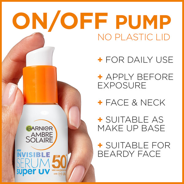 Garnier Ambre Solaire Invisible Super UV serum ochronne do twarzy SPF50+ to zaawansowany produkt zapewniający bardzo wysoką ochronę przed promieniowaniem UVB, UVA oraz długim zakresem fal UVA. Jego komfortowa formuła do codziennego użytku skutecznie chroni skórę przed szkodliwymi czynnikami zewnętrznymi i zanieczyszczeniami powietrza, pozostając niewidoczną na skórze.