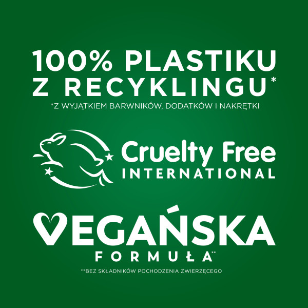 - Opakowanie w 100%** z plastiku z recyklingu (poza korkiem, barwnikiem i dodatkami)