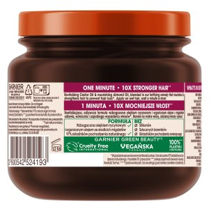Garnier Botanic Therapy maska przeciw wypadaniu włosów Olejek Rycynowy i Migdał łączy ekspercką wiedzę botaniczną z innowacyjną, wegańską formułą opracowaną specjalnie dla włosów osłabionych, z tendencją do wypadania spowodowanego łamliwością. Maska intensywnie odżywia, wzmacnia włosy oraz pomaga ograniczyć ich wypadanie, przywracając im zdrowy wygląd i blask.