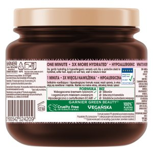 Garnier Botanic Therapy Oat Delicacy to hipoalergiczna maska dedykowana delikatnym włosom i skórze głowy. Eksperci Garnier wybrali krem ryżowy i organiczne mleko owsiane, aby stworzyć tę wyjątkową, wegańską formułę, która sprawia, że włosy stają się miękkie i trzy razy bardziej nawilżone. Produkt jest certyfikowany przez ECARF, co potwierdza jego bezpieczeństwo dla alergików. Opakowanie zostało wykonane w 100% z plastiku pochodzącego z recyklingu, co podkreśla zaangażowanie marki w ochronę środowiska.