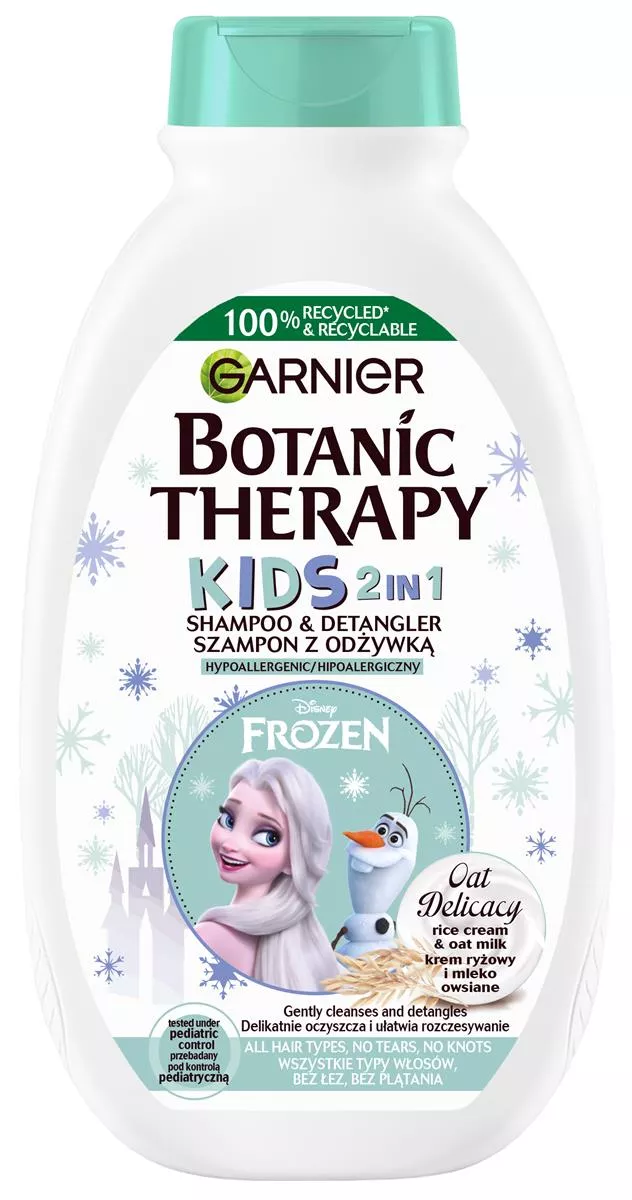 Spraw, by włosy Twojej księżniczki były jeszcze piękniejsze za pomocą naszego szamponu z odżywką 2 w 1, który delikatnie oczyszcza i rozplątuje włosy. Szampon został przebadany pod kontrolą pediatryczną i nadaje się do wszystkich typów włosów, nie powodując łez ani plątania. Eksperci Garnier w dziedzinie botaniki wybrali krem ryżowy i organiczne mleko owsiane pozyskiwane w zrównoważony sposób, aby stworzyć hipoalergiczną formułę naszego szamponu z odżywką dla dzieci. Produkt posiada certyfikat ECARF, co oznacza, że Fundacja Europejskiego Centrum Badań nad Alergią przetestowała jego formułę i zatwierdziła ją jako odpowiednią do stosowania przez alergików. Wszystkie nasze butelki są wykonane w 100% z plastiku pochodzącego z recyklingu (z wyjątkiem barwników, dodatków i nakrętki) i nadają się do ponownego przetworzenia. Szampon wyprodukowano w Polsce, w fabryce, która stosuje program zrównoważonego rozwoju.
