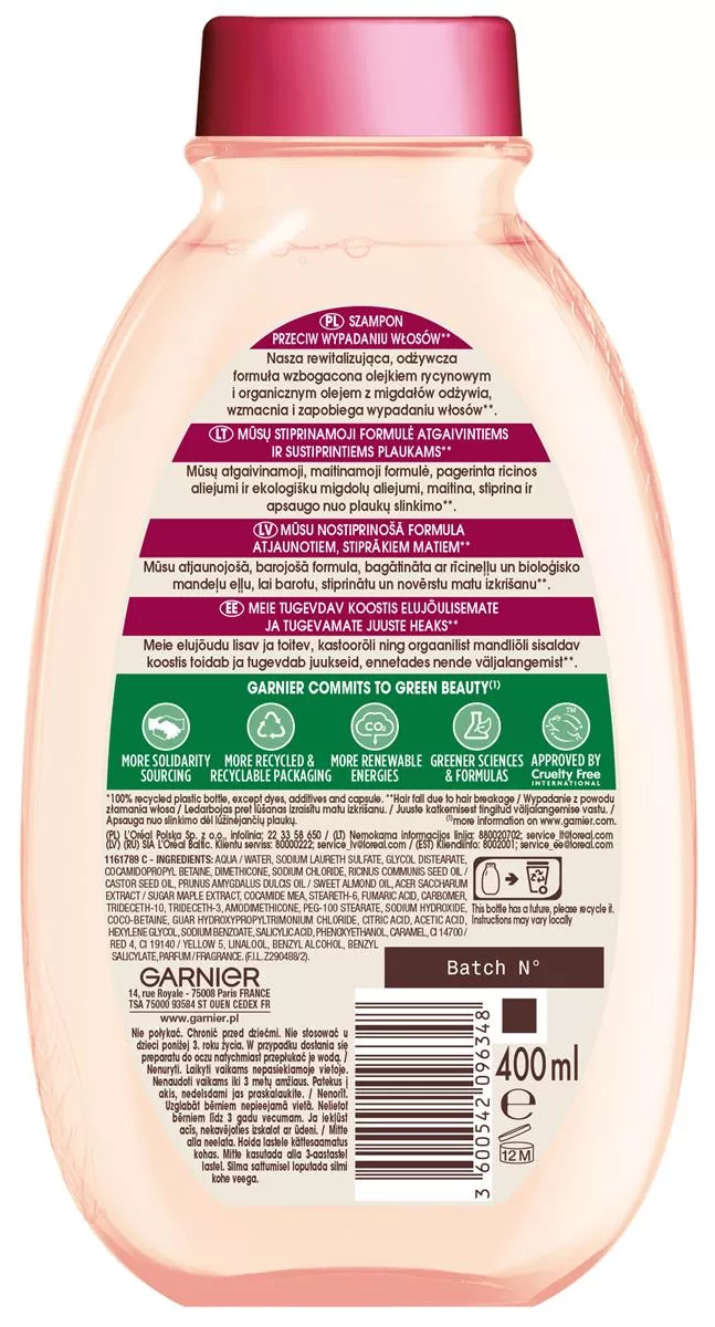Garnier Botanic Therapy Olejek rycynowy & Migdał Szampon wzmacniający to unikalna odżywcza formuła stworzona z myślą o włosach osłabionych i łamliwych. Dzięki niemu Twoje włosy staną się odżywione, pełne blasku i miękkie w dotyku, a wszystko to bez efektu obciążenia. Intensywna pielęgnacja wydobywa i podkreśla naturalne piękno włosów, jednocześnie wzmacniając je i odżywiając. Olejek rycynowy, znany z właściwości pielęgnacyjnych i zmiękczających, wzmacnia włosy od cebulek po same końce.