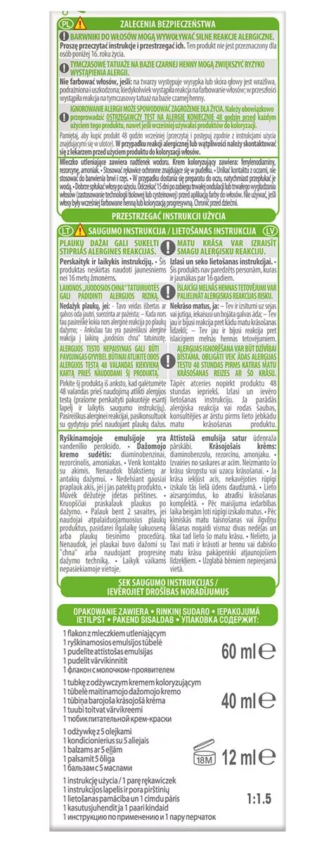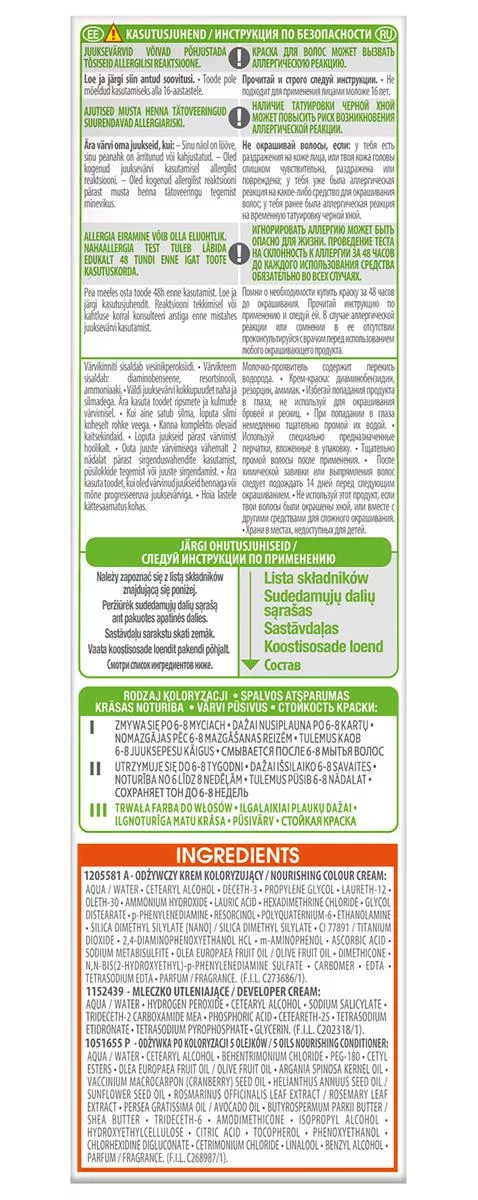 Głównymi składnikami są: Aqua / Water, Cetearyl Alcohol, Deceth-3, Propylene Glycol, Laureth-12, Oleth-30, Ammonium Hydroxide, Lauric Acid, Hexadimethrine Chloride, Glycol Distearate, P-phenylenediamine, Resorcinol, Polyquaternium-6, Ethanolamine, Silica Dimethyl Silylate [nano], Ci 77891 / Titanium Dioxide, 2,4-diaminophenoxyethanol Hcl, M-aminophenol, Ascorbic Acid, Sodium Metabisulfite, Olea Europaea Fruit Oil / Olive Fruit Oil, Dimethicone, N,n-bis(2-hydroxyethyl)-p-phenylenediamine Sulfate, Carbomer, Edta, Tetrasodium Edta, Parfum / Fragrance.