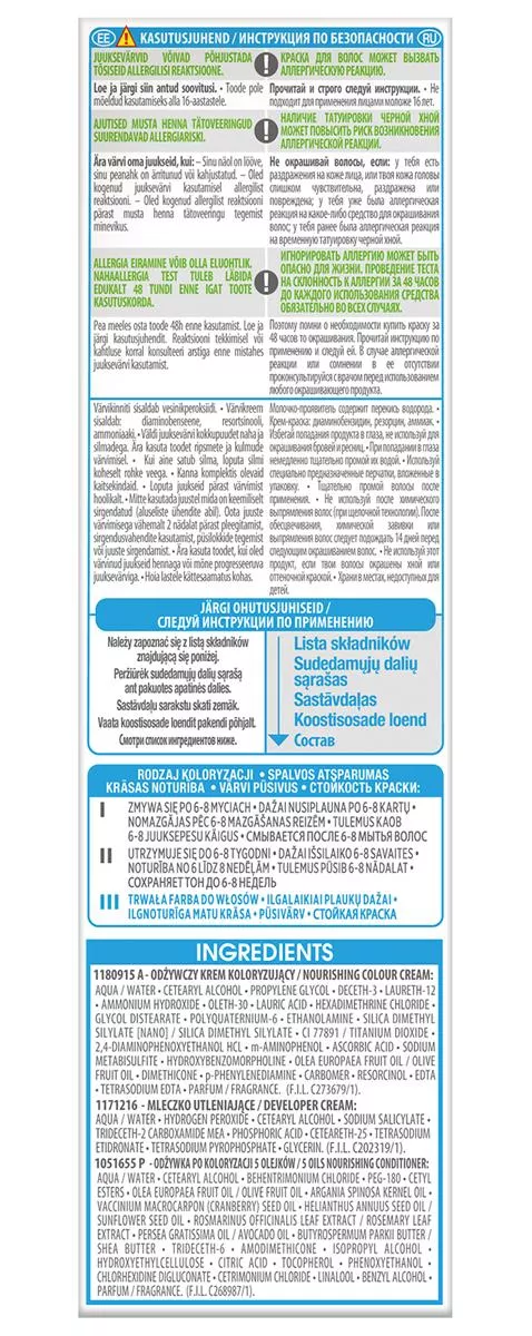 Aqua / Water, Cetearyl Alcohol, Propylene Glycol, Deceth-3, Laureth-12, Ammonium Hydroxide, Oleth-30, Lauric Acid, Hexadimethrine Chloride, Glycol Distearate, Polyquaternium-6, Ethanolamine, Silica Dimethyl Silylate [nano] / Silica Dimethyl Silylate, Ci 77891 / Titanium Dioxide, 2,4-Diaminophenoxyethanol Hcl, M-Aminophenol, Ascorbic Acid, Sodium Metabisulfite, Hydroxybenzomorpholine, Olea Europaea Fruit Oil / Olive Fruit Oil, Dimethicone, P-Phenylenediamine, Carbomer, Resorcinol, Edta, Tetrasodium Edta, Parfum / Fragrance (f.i.l. C273679/1).