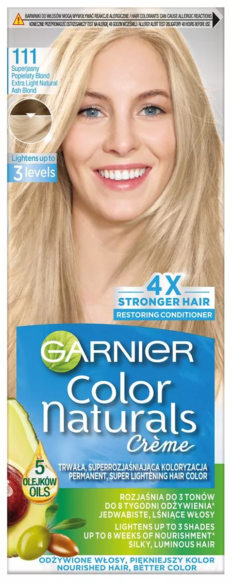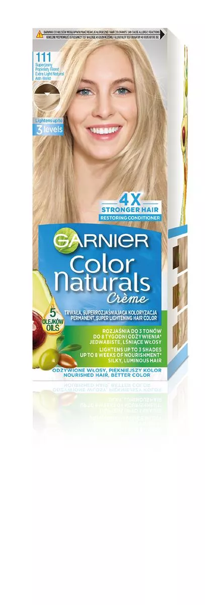 Garnier Color Naturals 111 Superjasny Popielaty Blond to farba do włosów, która zapewnia intensywny i długotrwały kolor, pokrywając nawet do 100% siwych włosów. Dzięki kremowej formule wzbogaconej o kompozycję trzech olejków, produkt nie tylko koloryzuje, ale również odżywia i wygładza włókna włosów, nadając im jedwabistą miękkość i blask.