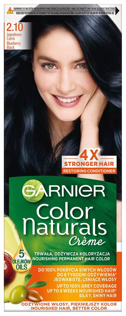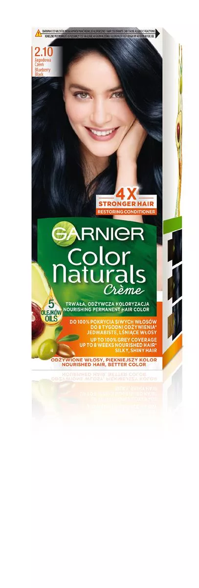 Garnier Color Naturals 2.10 Jagodowa Czerń to odżywcza farba do włosów, która zapewnia długotrwały kolor i do 100% pokrycia siwych włosów. Jej formuła została opracowana, aby nie tylko nadać włosom intensywny kolor, ale także je odżywić i uczynić bardziej miękkimi oraz błyszczącymi.