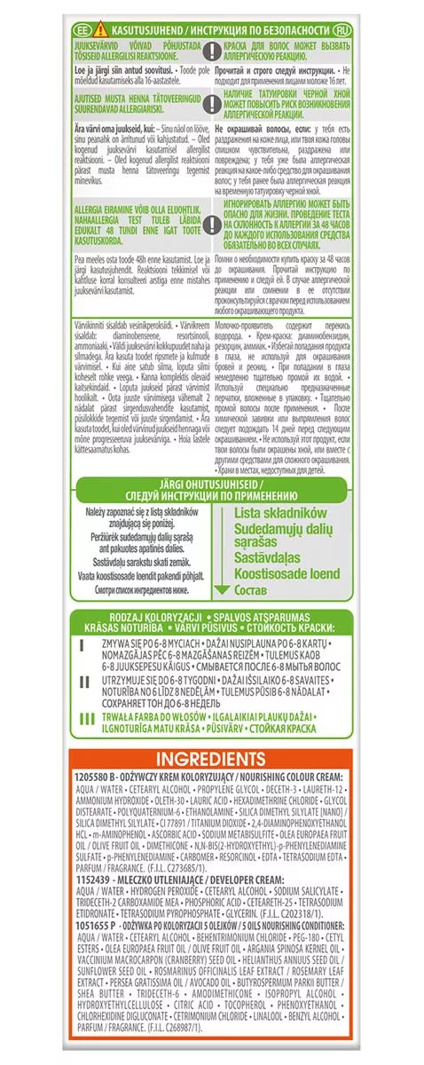 1205580 B - Aqua / Water, Cetearyl Alcohol, Propylene Glycol, Deceth-3, Laureth-12, Ammonium Hydroxide, Oleth-30, Lauric Acid, Hexadimethrine Chloride, Glycol Distearate, Polyquaternium-6, Ethanolamine, Silica Dimethyl Silylate [nano] / Silica Dimethyl Silylate, Ci 77891 / Titanium Dioxide, 2,4-diaminophenoxyethanol Hcl, M-aminophenol, Ascorbic Acid, Sodium Metabisulfite, Olea Europaea Fruit Oil / Olive Fruit Oil, Dimethicone, N,n-bis(2-hydroxyethyl)-p-phenylenediamine Sulfate, P-phenylenediamine, Carbomer, Resorcinol, Edta, Tetrasodium Edta, Parfum / Fragrance (f.i.l. C273685/1).
