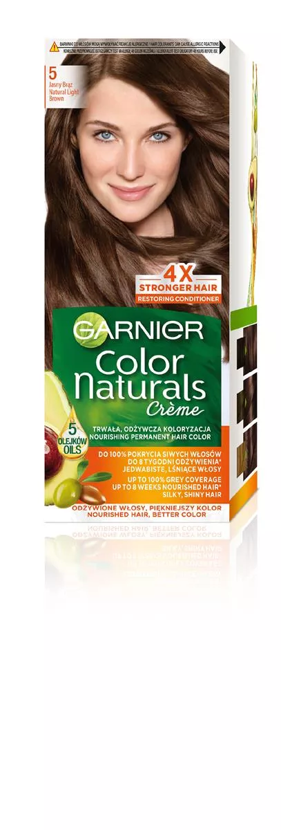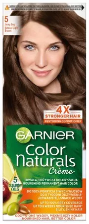 Garnier Color Naturals 5 Jasny Brąz to odżywcza farba do włosów, która oferuje długotrwały kolor i zapewnia do 100% pokrycia siwych włosów. Dzięki unikalnej formule wzbogaconej o trzy olejki, farba nie tylko koloryzuje, ale również odżywia, nadając włosom blask i jedwabistą miękkość.