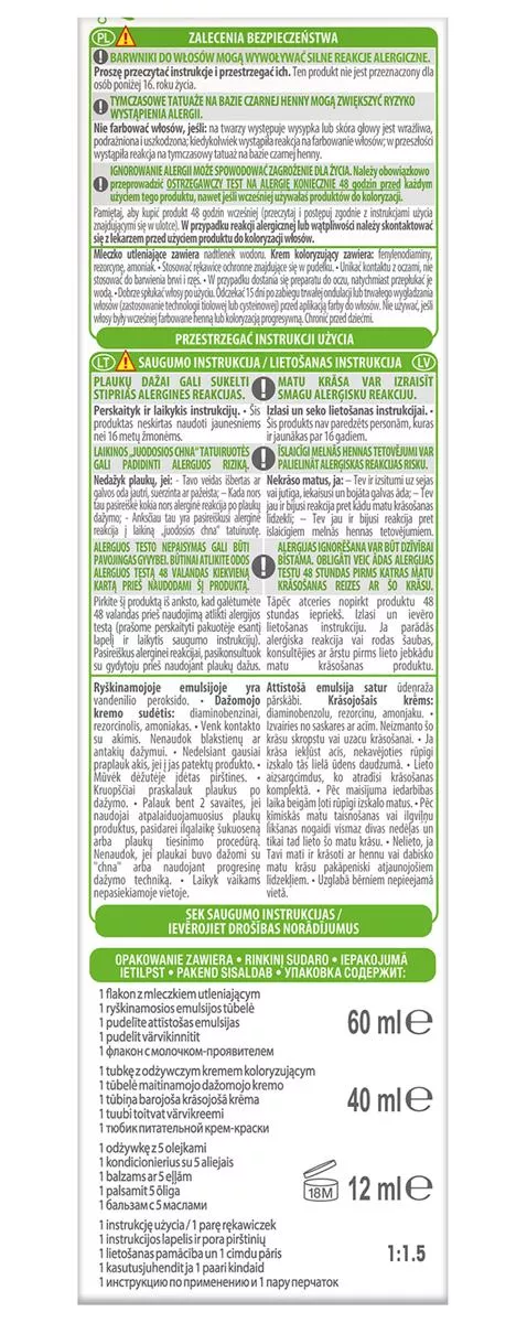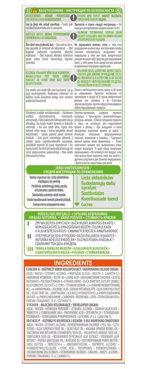 Składniki: Aqua / Water, Cetearyl Alcohol, Propylene Glycol, Deceth-3, Laureth-12, Ammonium Hydroxide, Oleth-30, Lauric Acid, Hexadimethrine Chloride, Glycol Distearate, Polyquaternium-6, Ethanolamine, Silica Dimethyl Silylate [nano], Ci 77891 / Titanium Dioxide, 2,4-diaminophenoxyethanol Hcl, M-aminophenol, Ascorbic Acid, Sodium Metabisulfite, Olea Europaea Fruit Oil / Olive Fruit Oil, Dimethicone, N,n-bis(2-hydroxyethyl)-p-phenylenediamine Sulfate, P-phenylenediamine, Carbomer, Resorcinol, Edta, Tetrasodium Edta, Parfum / Fragrance.