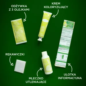- Aby zakończyć koloryzację, nałóż na całą długość włosów pielęgnującą odżywkę z 3 olejkami. Pozostaw na kilka minut, a następnie spłucz. Twoje włosy będą pełne blasku, elastyczne i miękkie w dotyku.