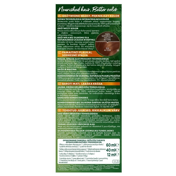 Farba do włosów Garnier Color Naturals w odcieniu 5.34 Złocisty Kasztanowy Brąz to idealny wybór dla osób szukających intensywnego i promiennego koloru. Dzięki zaawansowanej technologii wzmacniającej kolor, produkt ten skutecznie scala kolor z włóknem włosa, zapewniając długotrwały efekt koloryzacji oraz do 100% pokrycia siwych włosów. Farba jest odpowiednia dla każdego rodzaju włosów, dostosowując się do ich naturalnej struktury.