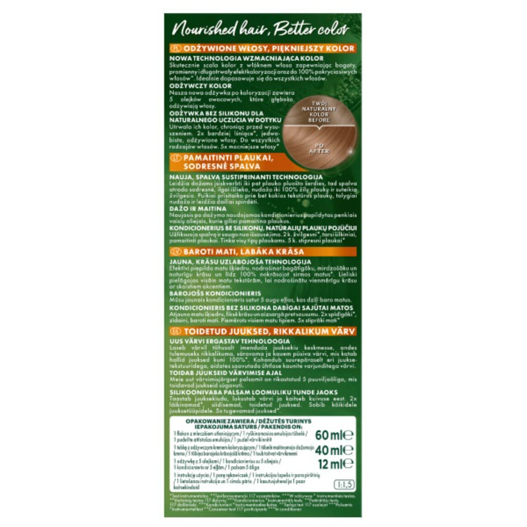 Garnier Color Naturals odżywcza farba do włosów w odcieniu 7.3 Naturalny Złocisty Blond to doskonały wybór dla osób poszukujących intensywnego i długotrwałego koloru. Dzięki zaawansowanej technologii wzmacniającej kolor, farba skutecznie scala się z włóknem włosa, zapewniając bogaty i promienny efekt koloryzacji. Produkt gwarantuje do 100% pokrycia siwych włosów, co czyni go idealnym rozwiązaniem dla wszystkich typów włosów.