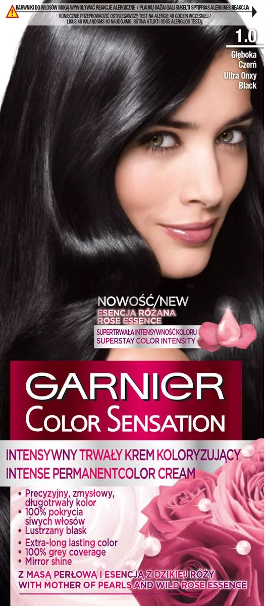 Garnier Color Sensation Krem koloryzujący 1.0 Głęboka onyksowa czerń to idealne rozwiązanie dla osób poszukujących długotrwałego, zmysłowego koloru z lustrzanym blaskiem. Oferuje nawet do 100% pokrycia siwych włosów, zapewniając intensywny i precyzyjny odcień.