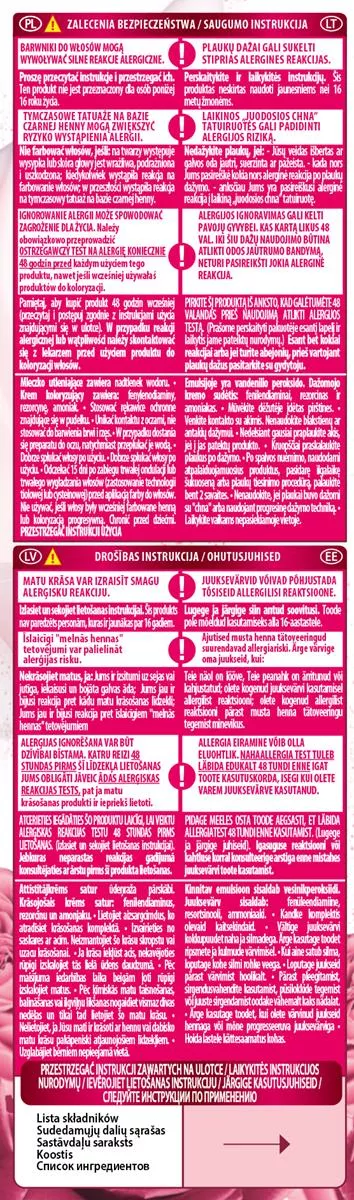 Ważne: Przed użyciem należy przestrzegać zaleceń i przeprowadzić ostrzegawczy test na alergię 48 godzin wcześniej. Barwniki do włosów mogą wywoływać silne reakcje alergiczne, dlatego ważne jest, aby przeczytać instrukcje i ich przestrzegać. Produkt nie jest przeznaczony dla osób poniżej 16. roku życia. Tymczasowe tatuaże na bazie czarnej henny mogą zwiększyć ryzyko wystąpienia alergii. Nie farbować włosów, jeśli na twarzy występuje wysypka lub skóra głowy jest wrażliwa, podrażniona.
