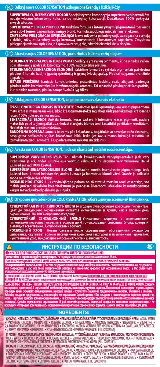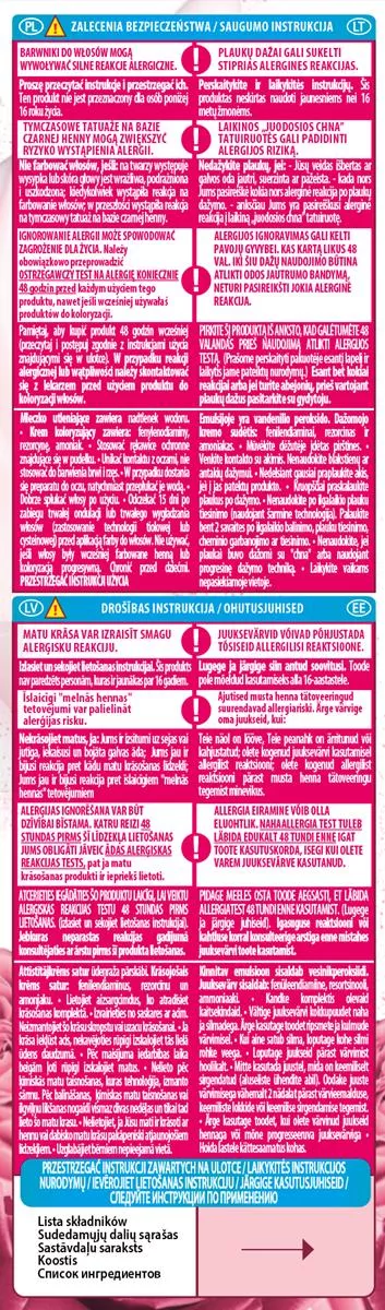 Przed użyciem należy przeprowadzić ostrzegawczy test na alergię 48 godzin wcześniej. Barwniki do włosów mogą wywoływać silne reakcje alergiczne. Przeczytaj instrukcje i przestrzegaj ich. Produkt nie jest przeznaczony dla osób poniżej 16. roku życia. Unikaj używania, jeśli na twarzy występuje wysypka lub skóra głowy jest wrażliwa, podrażniona.