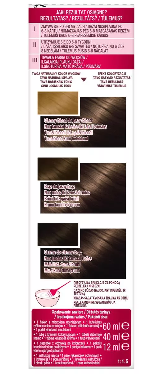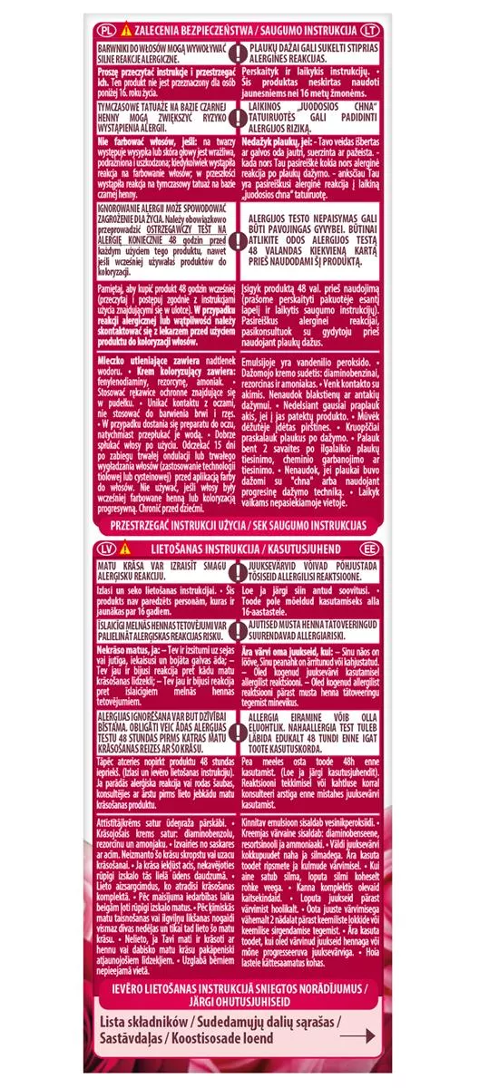 Aby uzyskać najlepsze rezultaty, postępuj zgodnie z instrukcjami zawartymi w opakowaniu. Przeprowadź ostrzegawczy test na alergię 48 godzin przed użyciem. Barwniki do włosów mogą wywoływać silne reakcje alergiczne, dlatego ważne jest, aby przeczytać instrukcje i ich przestrzegać. Produkt nie jest przeznaczony dla osób poniżej 16. roku życia.