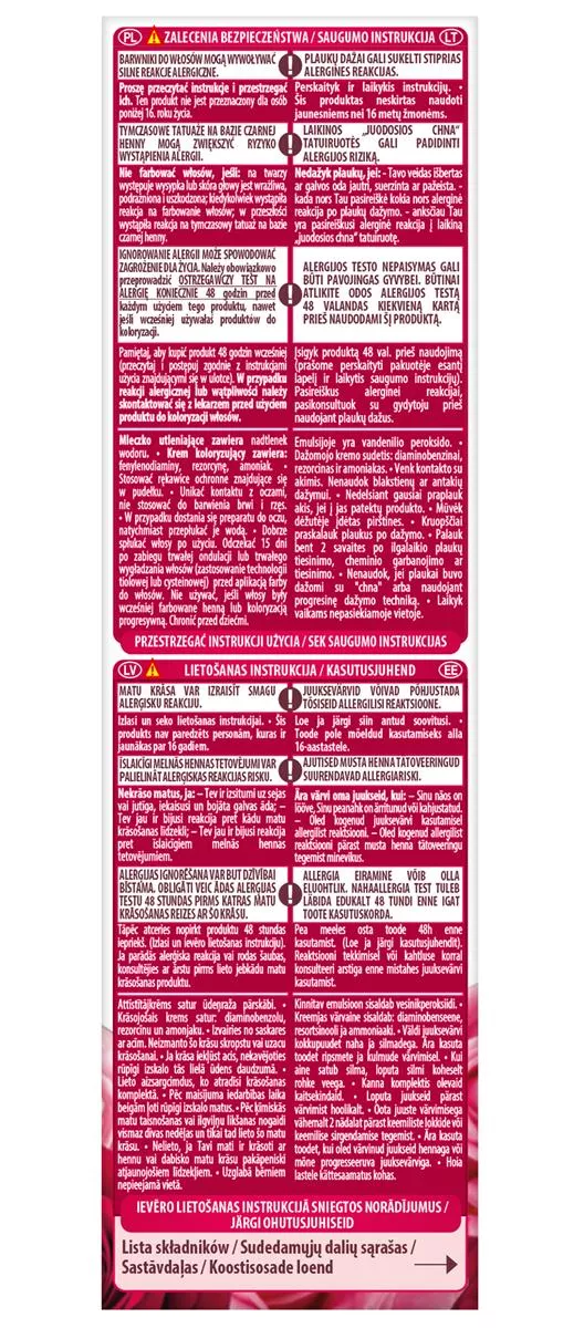 Ważne jest przestrzeganie zaleceń użycia i przeprowadzenie ostrzegawczego testu na alergię 48 godzin przed użyciem. Barwniki do włosów mogą wywoływać silne reakcje alergiczne, dlatego należy dokładnie przeczytać i przestrzegać instrukcji. Produkt nie jest przeznaczony dla osób poniżej 16. roku życia. Tymczasowe tatuaże na bazie czarnej henny mogą zwiększyć ryzyko wystąpienia alergii. Nie farbować włosów, jeśli na twarzy występuje wysypka lub skóra głowy jest wrażliwa, podrażniona.