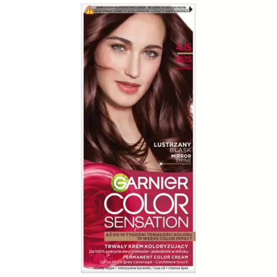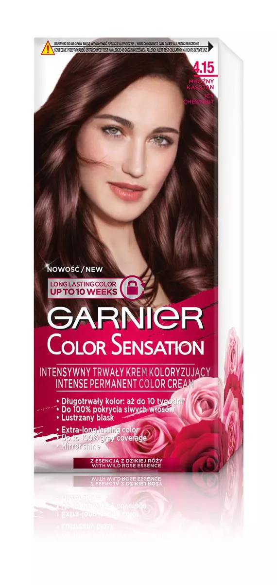 Krem koloryzujący Garnier Color Sensation 4.15 Mroźny Kasztan to idealne rozwiązanie dla osób poszukujących długotrwałego i zmysłowego koloru z lustrzanym blaskiem. Dzięki zaawansowanej formule z masą perłową i olejkiem kwiatowym, produkt zapewnia nawet do 100% pokrycia siwych włosów, nadając im wyjątkowy blask i jedwabistą miękkość.