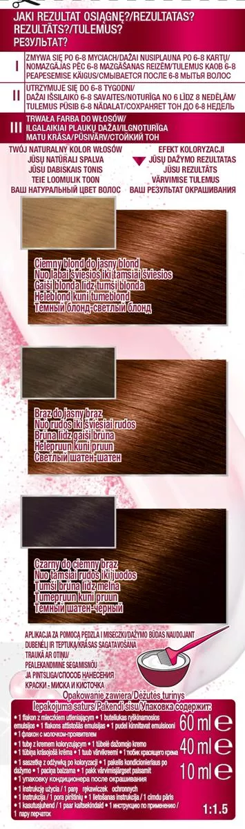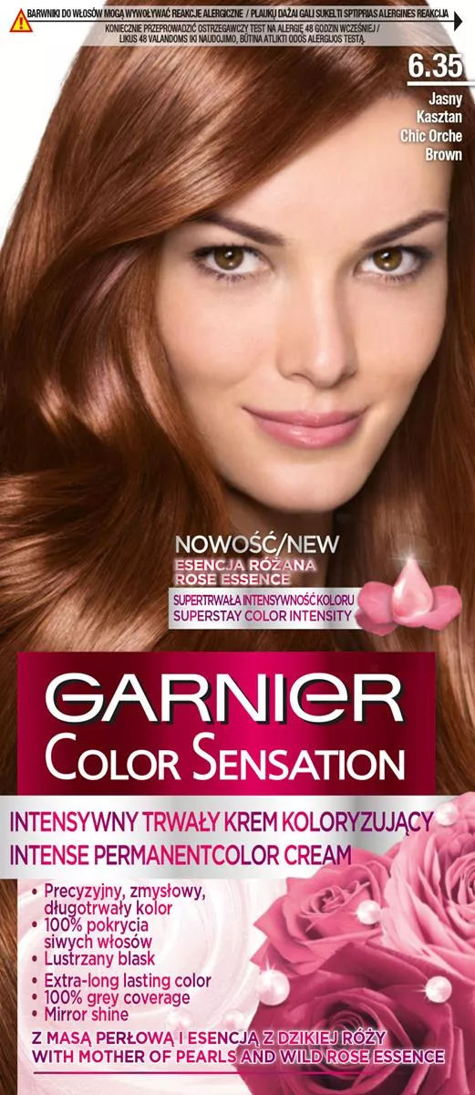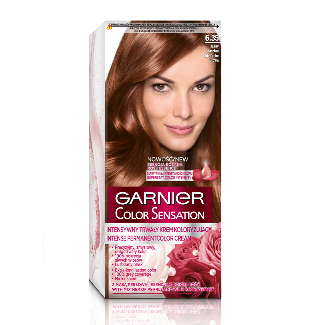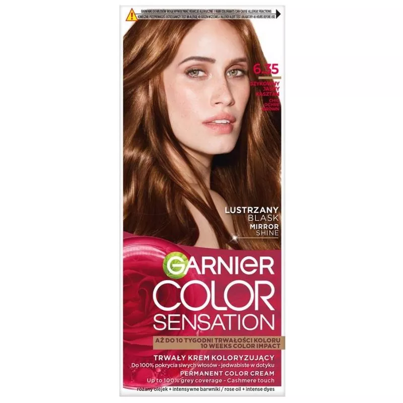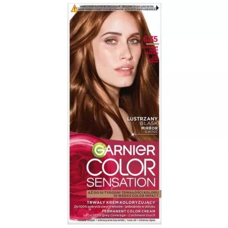 Krem koloryzujący Garnier Color Sensation w odcieniu 6.35 Szykowny Jasny Kasztan zapewnia długotrwały, zmysłowy kolor z lustrzanym blaskiem oraz do 100% pokrycia siwych włosów. Dzięki wyjątkowej formule, włosy stają się nie tylko piękne, ale również jedwabiście miękkie.
