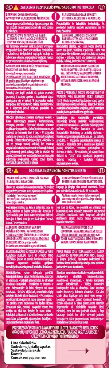 Przestrzegaj zaleceń użycia i koniecznie przeprowadź ostrzegawczy test na alergię 48 godzin przed aplikacją. Barwniki do włosów mogą wywołać silne reakcje alergiczne, dlatego ważne jest, aby przeczytać instrukcje i się do nich stosować. Produkt nie jest przeznaczony dla osób poniżej 16. roku życia. Nie farbuj włosów, jeśli na twarzy występuje wysypka lub skóra głowy jest wrażliwa bądź podrażniona.