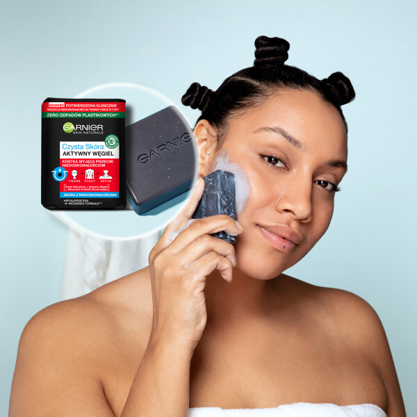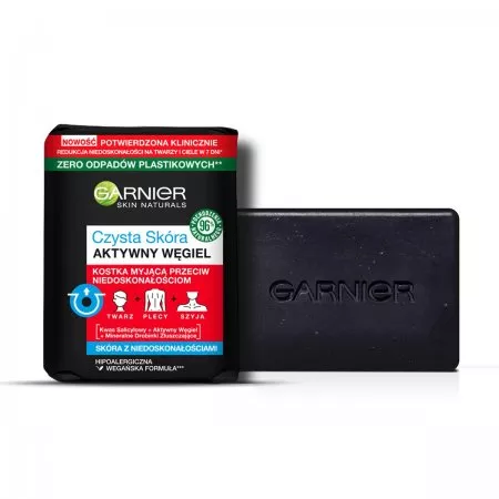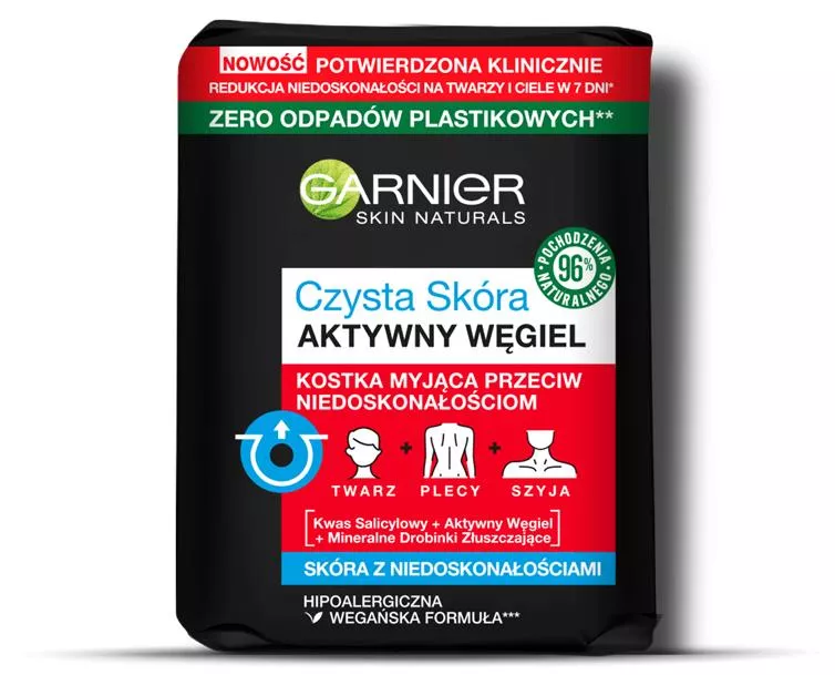 Garnier Czysta Skóra Kostka myjąca przeciw niedoskonałościom na twarzy i ciele to innowacyjne rozwiązanie, które gwarantuje klinicznie potwierdzoną redukcję niedoskonałości już w 7 dni*. Dzięki zawartości węgla i kwasu salicylowego, produkt intensywnie oczyszcza skórę, eliminując zaskórniki oraz nadmiar sebum zarówno na twarzy, jak i ciele. Już po jednym użyciu zauważysz, że 85% zanieczyszczeń zostanie usuniętych z twarzy, a 89% skóry na plecach i szyi stanie się widocznie oczyszczone. Po tygodniu regularnego stosowania niedoskonałości na twarzy są mniej widoczne o 72%, a na plecach i szyi o 62%.