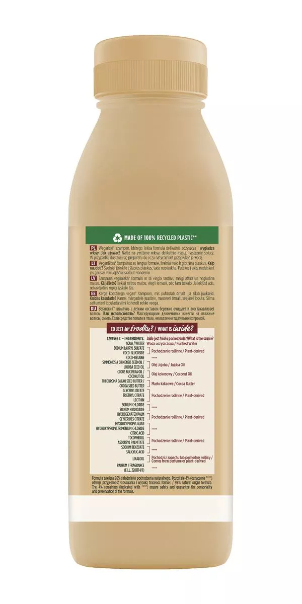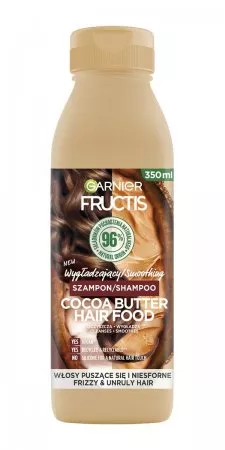 Garnier Fructis Cocoa Butter Hair Food to wegański*, w 97% pochodzenia naturalnego** wygładzający szampon zaprojektowany specjalnie dla włosów bardzo suchych. Jego innowacyjna formuła szybko wchłania się we włosy, zapewniając natychmiastowe odżywienie i ułatwiając rozczesywanie. Produkt jest przyjazny dla środowiska – butelka w 100% nadaje się do recyklingu i jest wykonana w 100% z plastiku*** z recyklingu, co przyczynia się do zmniejszenia zużycia zasobów planety.