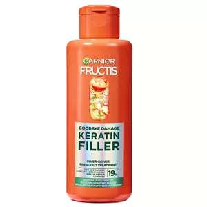 Odkryj moc odbudowy włosów z kuracją Garnier Fructis Goodbye Damage Keratin Filler. Ta innowacyjna kuracja do włosów do spłukiwania, wzbogacona 19% keratynowym kompleksem, przenika przez powierzchnię włosa, wypełniając i odbudowując jego strukturę. Dzięki temu włókna włosów są wzmocnione, a ich łuski zamknięte, co pozwala odzyskać zdrowy wygląd i blask.