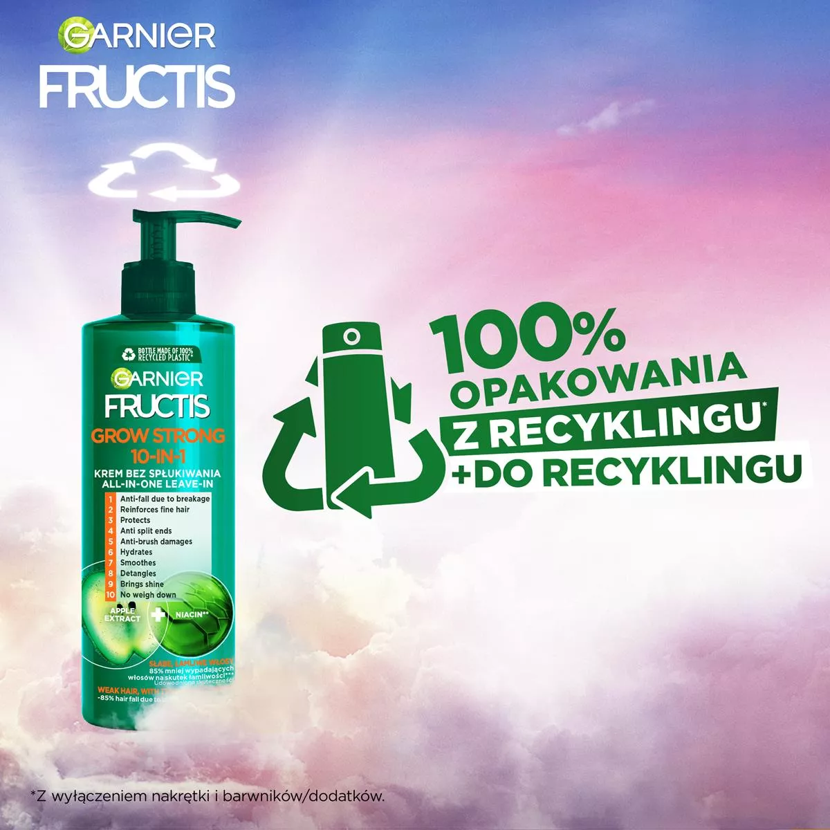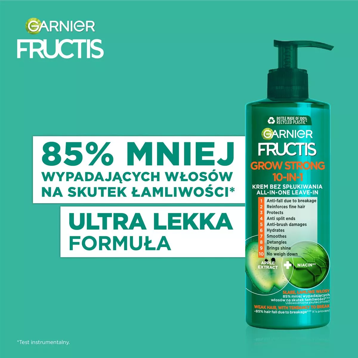 Fructis Grow Strong 10 w 1 to ultralekki krem do włosów bez spłukiwania, który doskonale wzmacnia słabe i cienkie włosy. Jego unikalna formuła łączy ekstrakt z jabłka z niacyną* i jest idealna dla włosów z tendencją do łamliwości. Krem przeciwdziała rozdwajaniu końcówek, nawilża, wygładza, ułatwia rozczesywanie i nadaje blask włosom. Dzięki lekkiej konsystencji jest idealnym wyborem dla osób z cienkimi włosami. Udowodniona skuteczność: aż 85% mniej wypadających włosów na skutek łamliwości**. Wprowadź ten krem do swojej rutyny pielęgnacyjnej i zobacz różnicę!