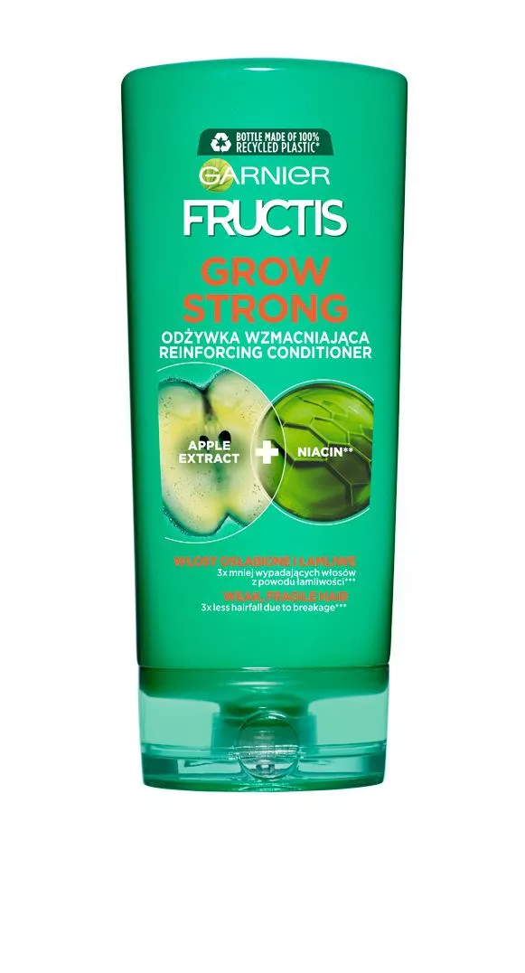 Garnier Fructis Grow Strong to odżywka wzmacniająca stworzona specjalnie do pielęgnacji włosów osłabionych. Dzięki unikalnej formule, produkt nie tylko odżywia i pielęgnuje włosy, ale także pomaga im odzyskać naturalny blask i świetną kondycję. Wzmacnia włókna włosów, co sprawia, że stają się one silniejsze i bardziej odporne na wypadanie oraz ułatwia uporanie się z widocznym łupieżem.