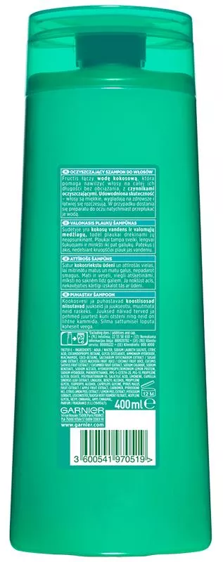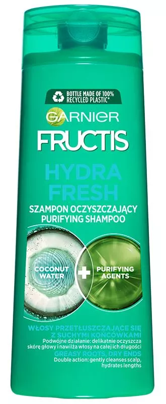 Garnier Fructis Hydra Fresh to szampon oczyszczający o pojemności 400 ml, który został stworzony z myślą o widocznie zdrowszych i mocniejszych włosach. Dzięki unikalnej formule, zawierającej białka z cytryny, witaminy B3 i B6 oraz ekstrakty z owoców i roślin, zapewnia skuteczne oczyszczenie i nawilżenie włosów bez ich obciążania. Woda kokosowa zawarta w szamponie pomaga nawilżyć włosy na całej długości, pozostawiając je miękkie i łatwe do rozczesania.